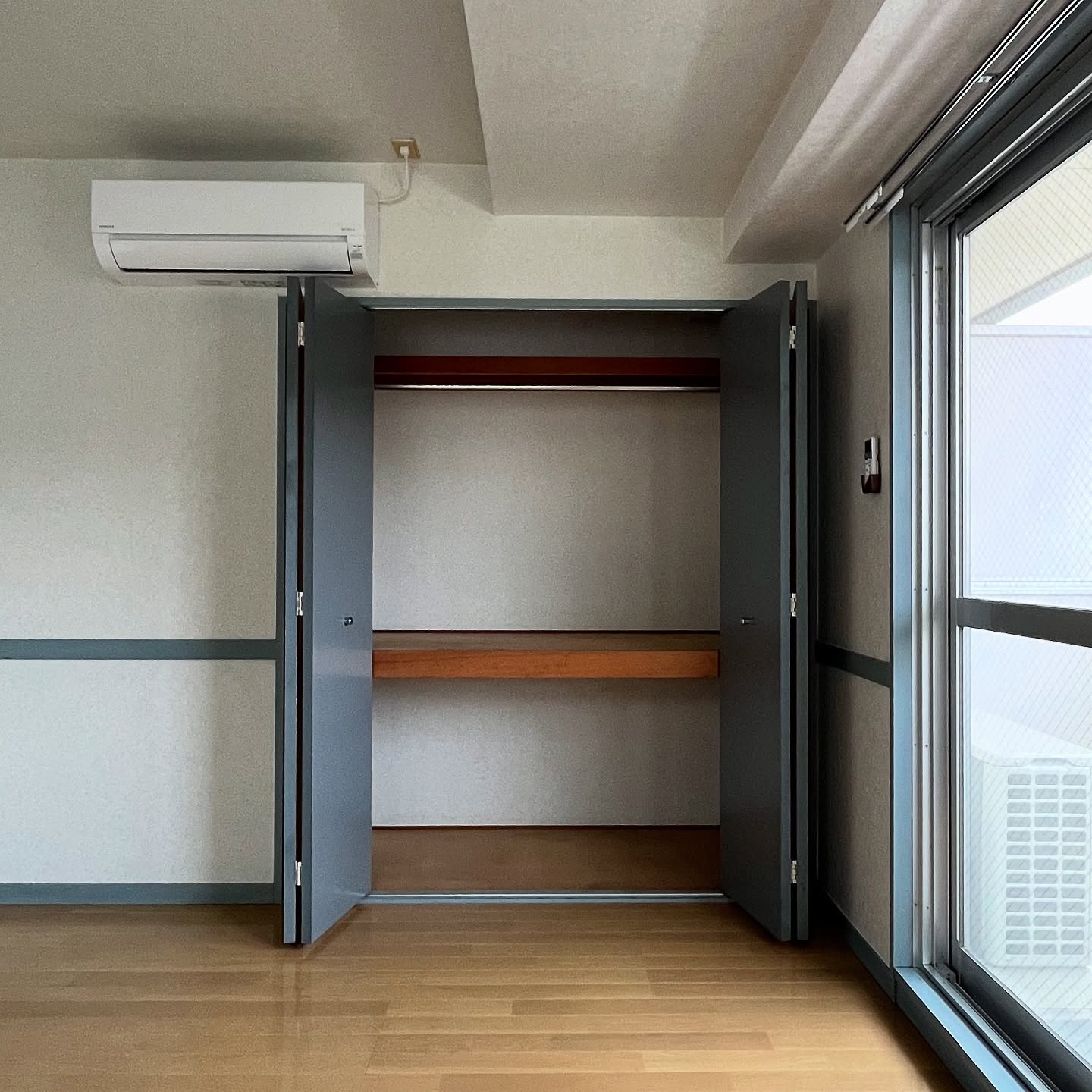部屋のカラーは落ち着いたブルーで統一感があり、気持ちクール目デザインです。