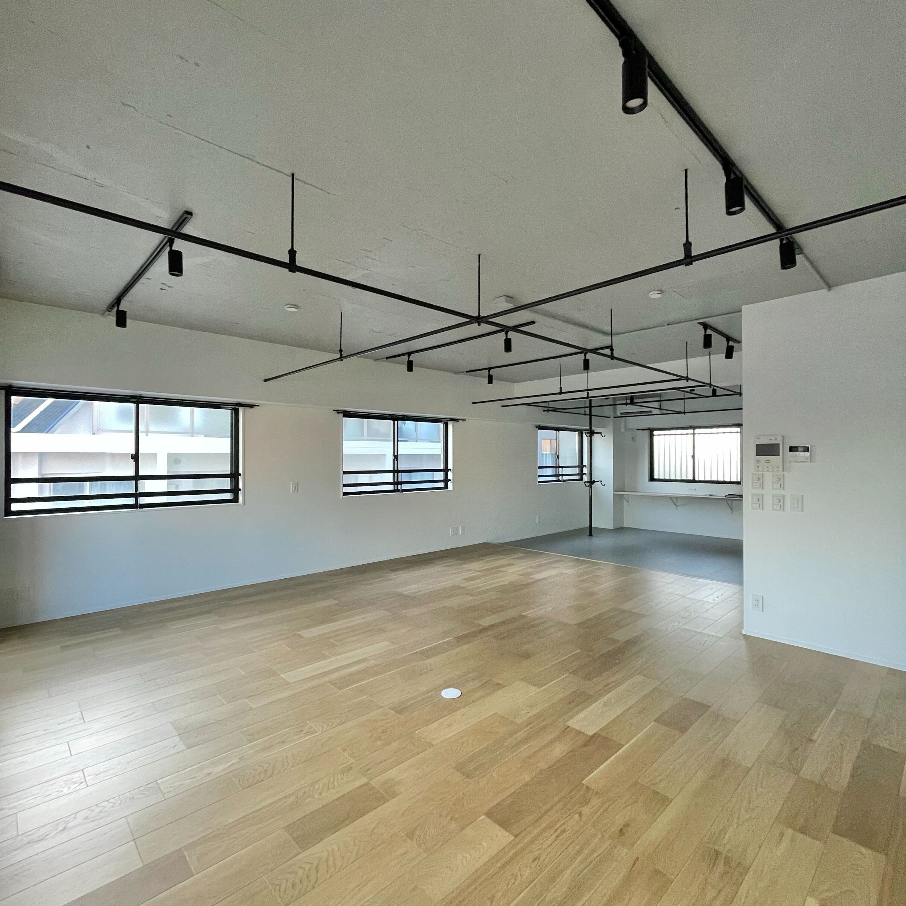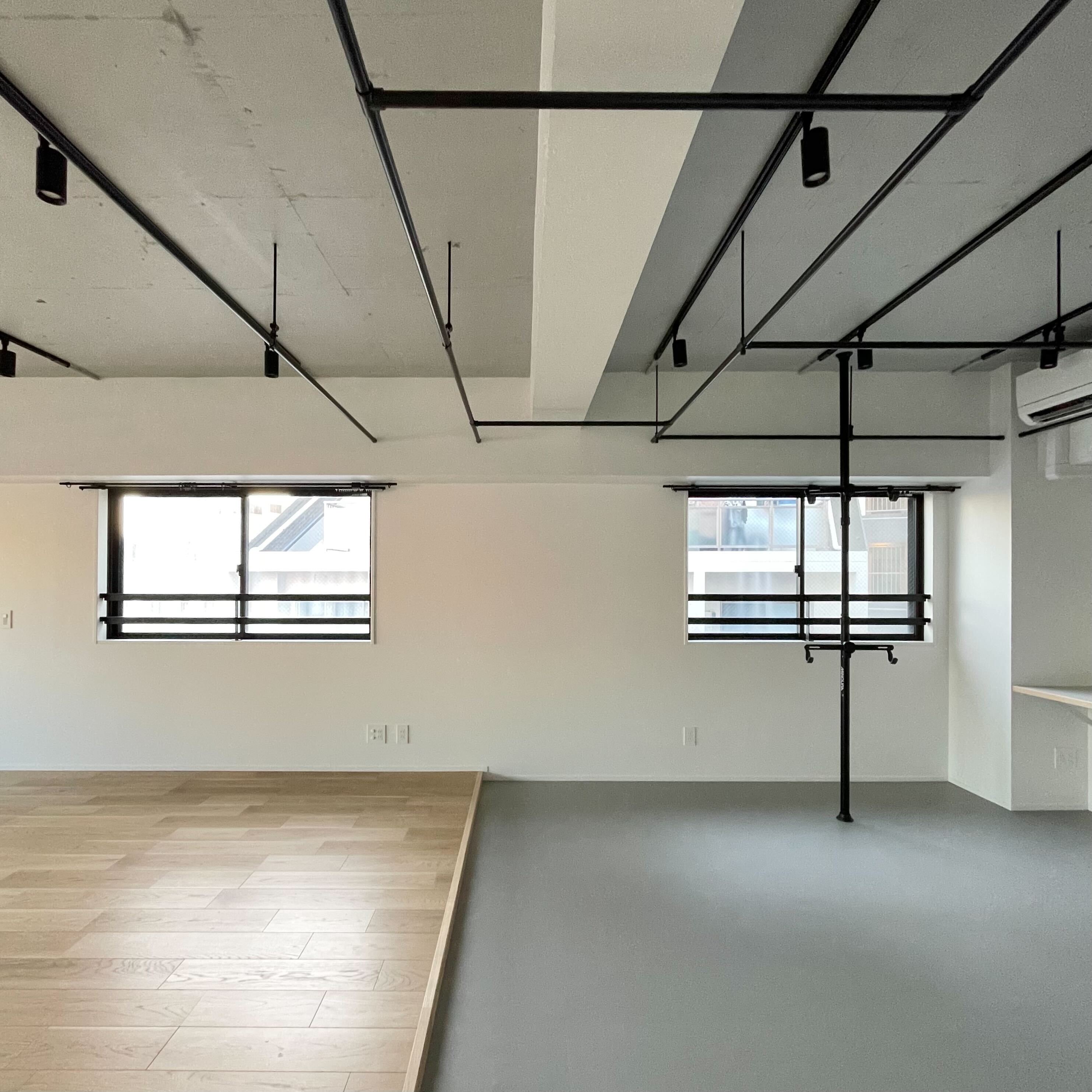 ワンルームとはいえ、区切りたい場合は区切れるように、天井にはカーテンを吊るせるようなパイプが張り巡らされております。