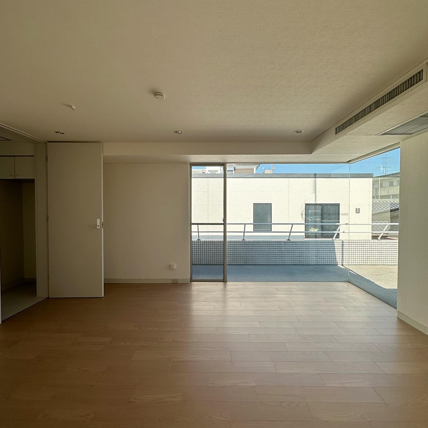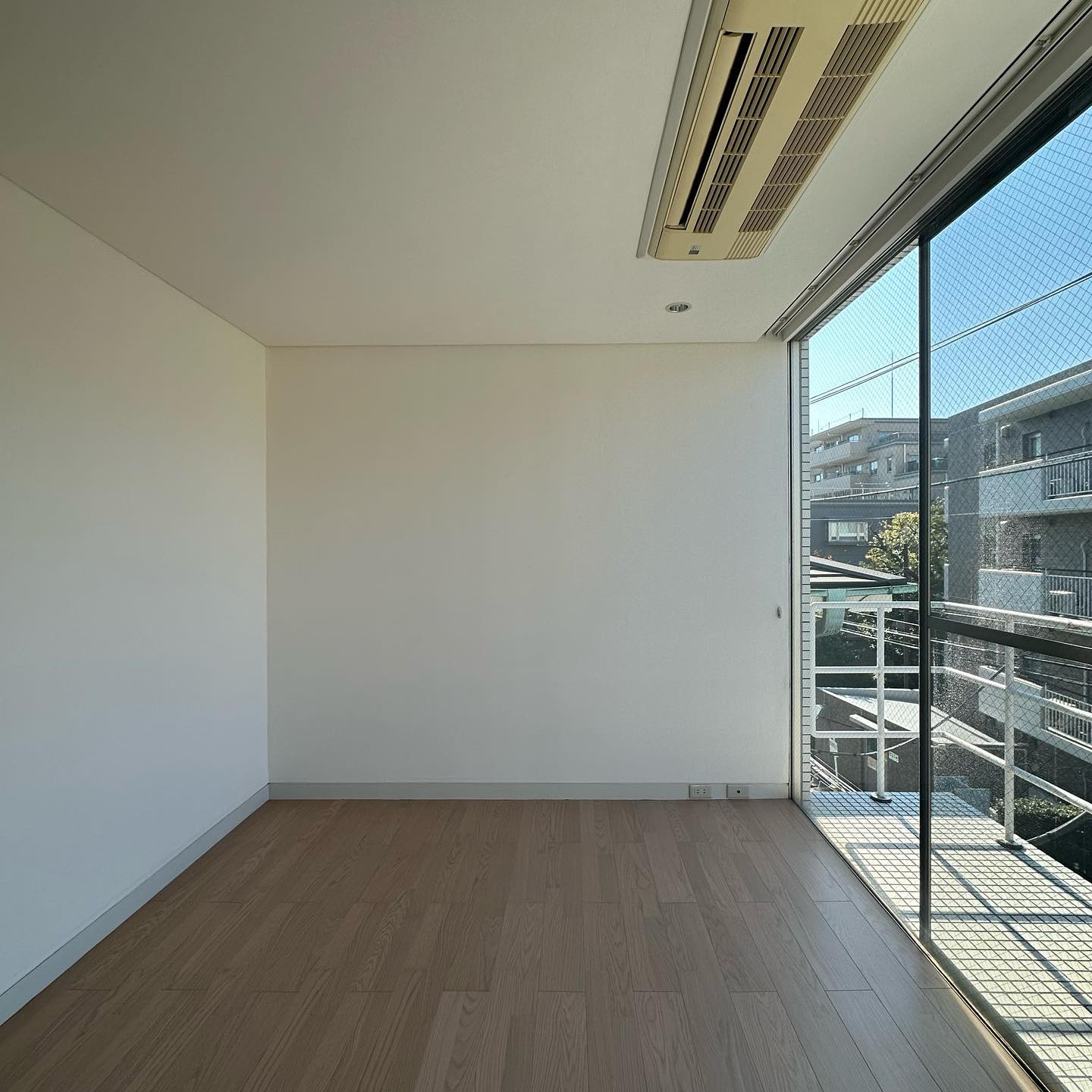 白をベースとした空間は、生活感を極限まで見えない使用。コンセントは巾木の位置にあり、エアコンはもはや見えません。。窓枠もない、、すっきりした洗練されたお部屋。