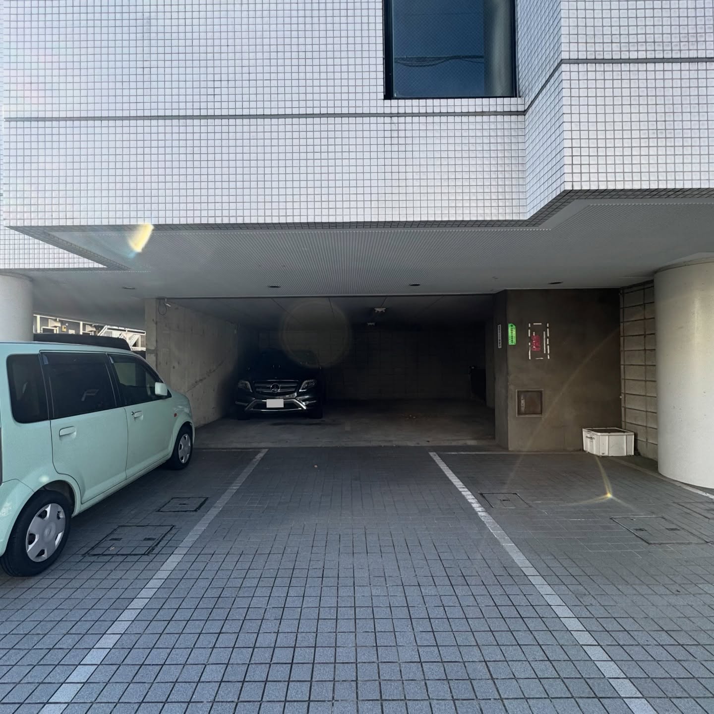 タイル張りにガラスブロックが映える外観。